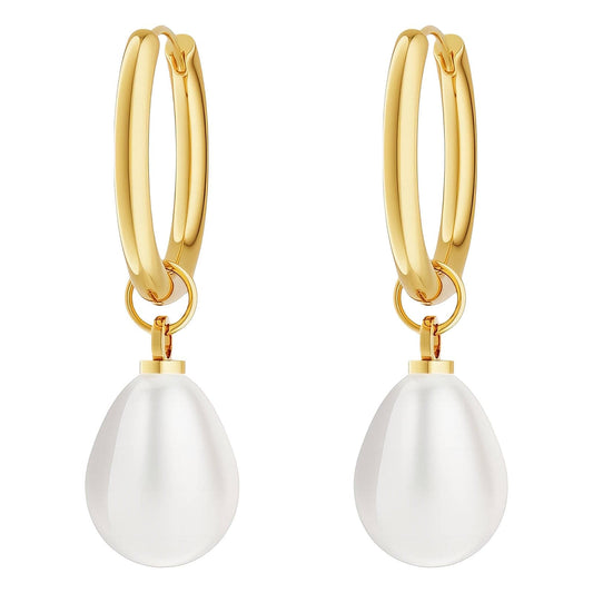 Gold Hoop Earrings, with Faux Pearl Drop, 18K Gold Plated Steel